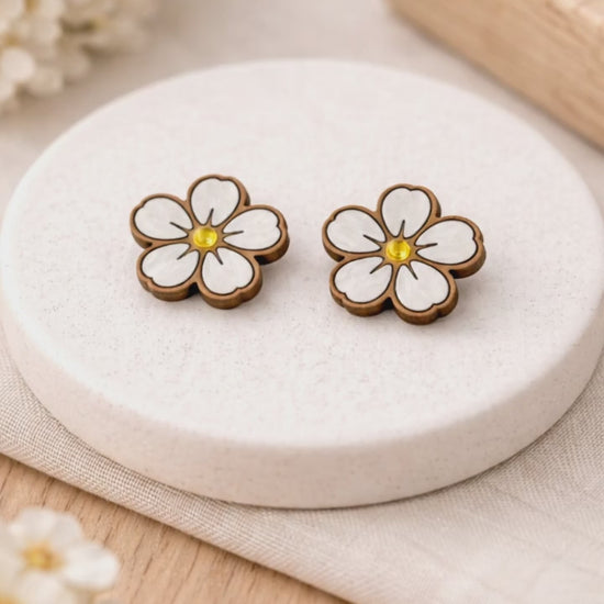 These handmade floral stud earrings feature a clean white blossom design set against natural wood, finished with a luminous golden center for a subtle touch of warmth and elegance. Lightweight and comfortable for everyday wear, they bring a fresh, spring-inspired charm to any outfit.