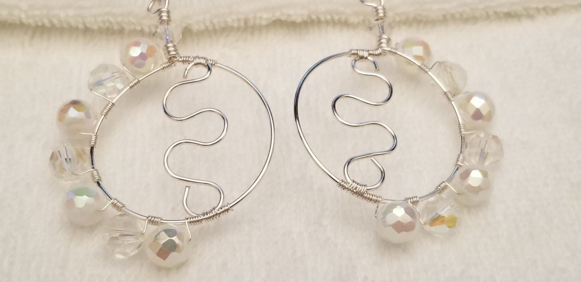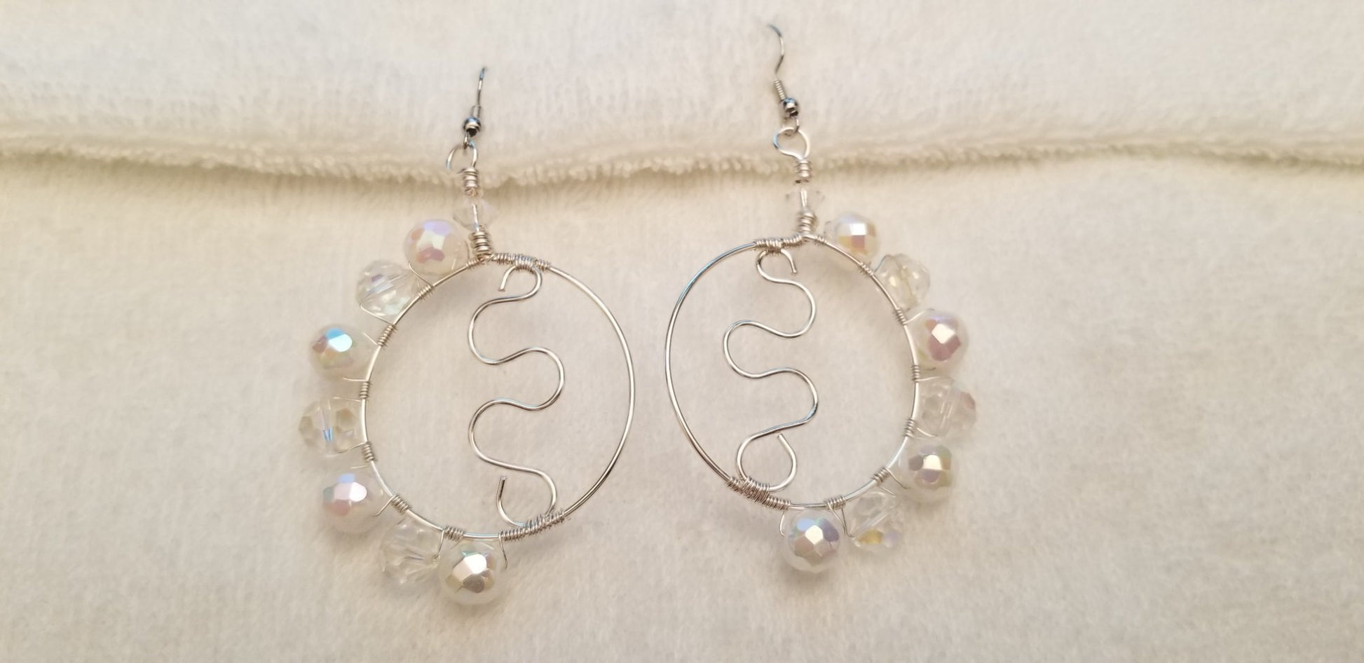 Beautiful handmade wire-wrapped hoop earrings featuring shimmering clear and iridescent beads. Each hoop is crafted with silver tone wire and accented with a unique wavy center design, giving them a modern, airy, and elegant look. Lightweight and comfortable for everyday wear or special occasions.