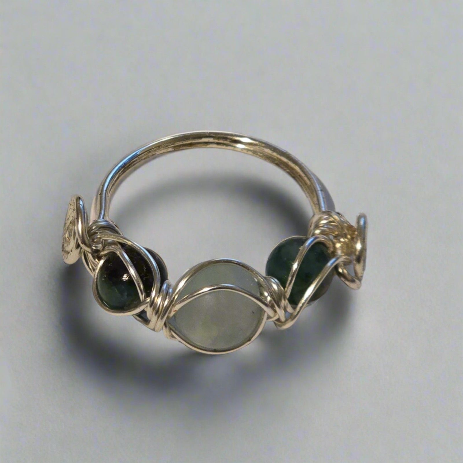 Handmade Wire Wrapped Aquamarine & Emerald Ring – Silver Tone Band